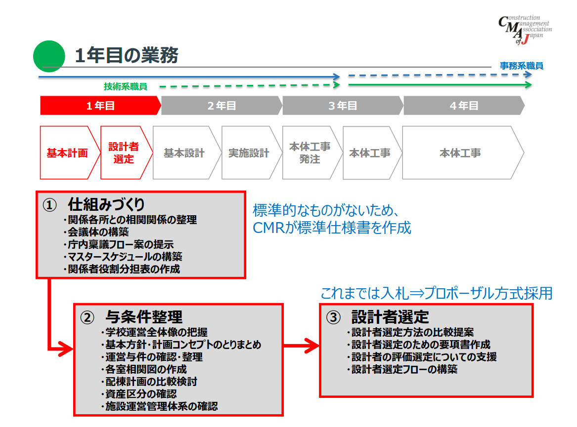 3、4枚目のシートは「CMrの業務内容と効果」です。実際に4年間かけて行われた小学校建替え事業で実施されたCM業務の前半の流れを示しています。